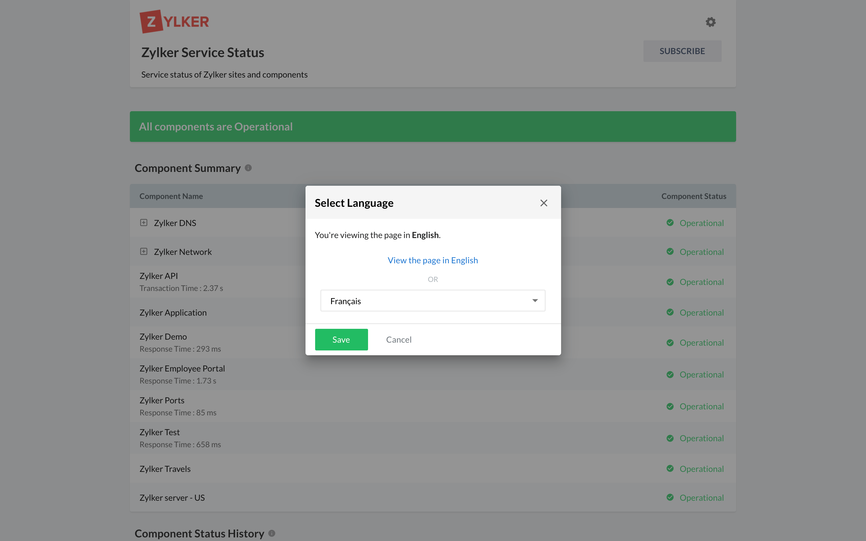 This feature is available for both Blue plan and Green page. You can now view your status page in a language of your preference. By clicking the Settings icon on the top right side of your public status page, you can choose your preferred language from the drop-down list and click Save. We support 55+ languages including French, Bahasa Indonesia, Japanese, Chinese, Thai, German, Portuguese, and Spanish.
