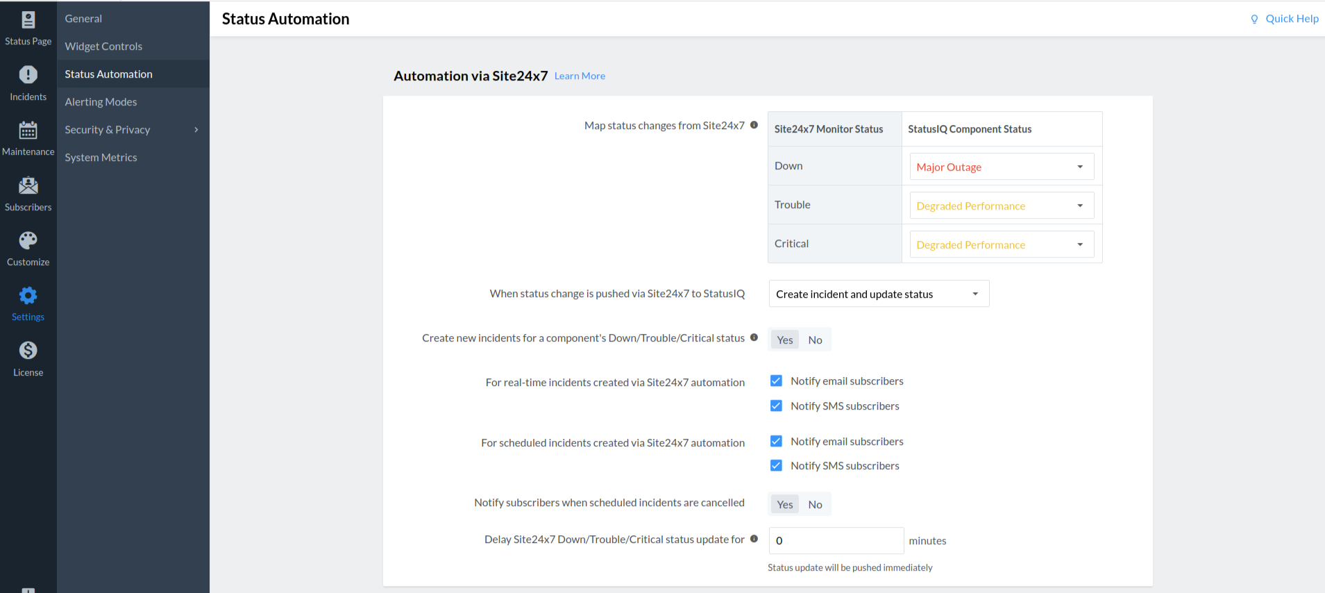 • Delay Site24x7 Down/Trouble/Critical status update for: Postpone incident creation or status changes for brief outages and fluctuations by configuring a delay of up to 60 minutes. Choose zero minutes to receive status updates instantly according to the notification profile settings in Site24x7.