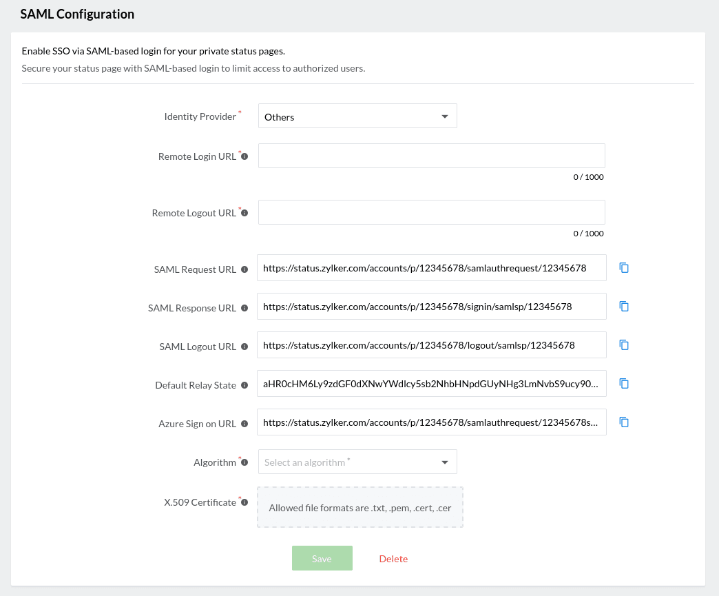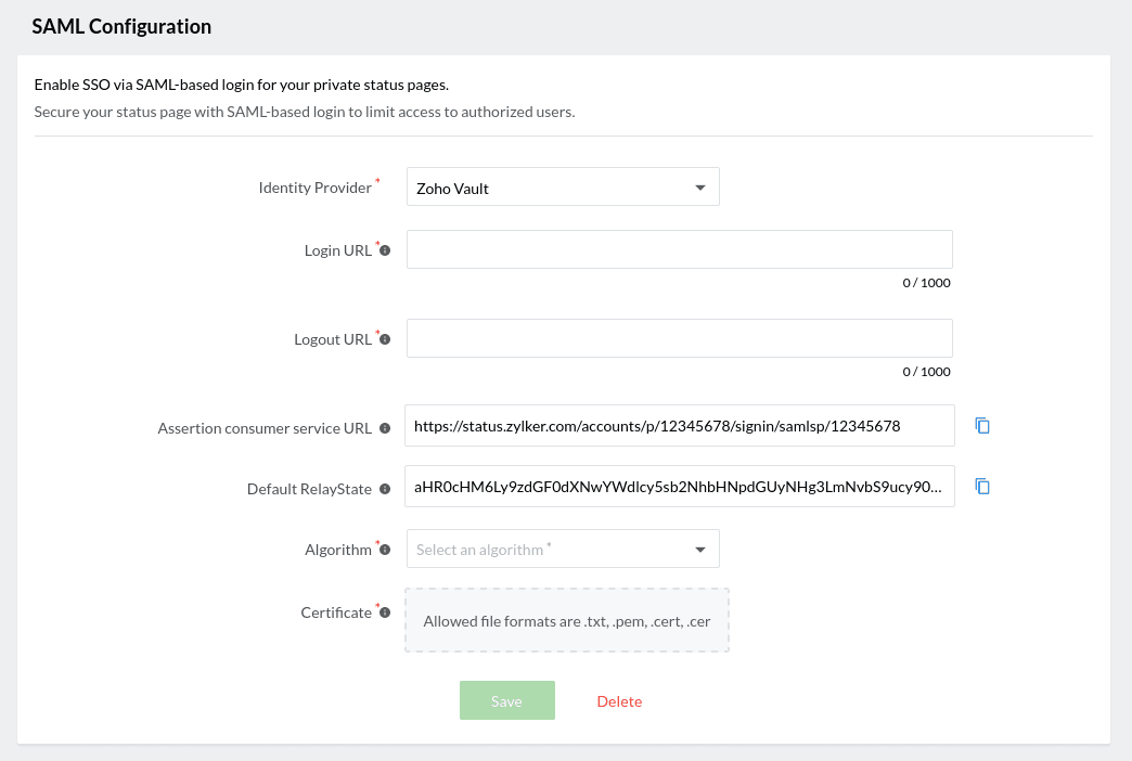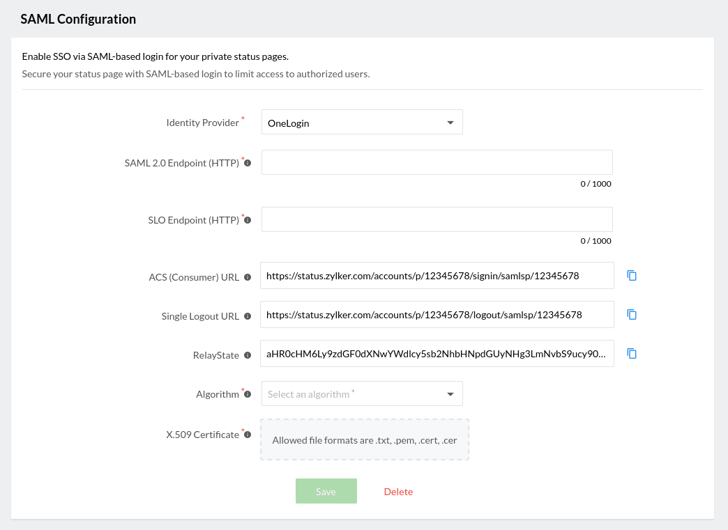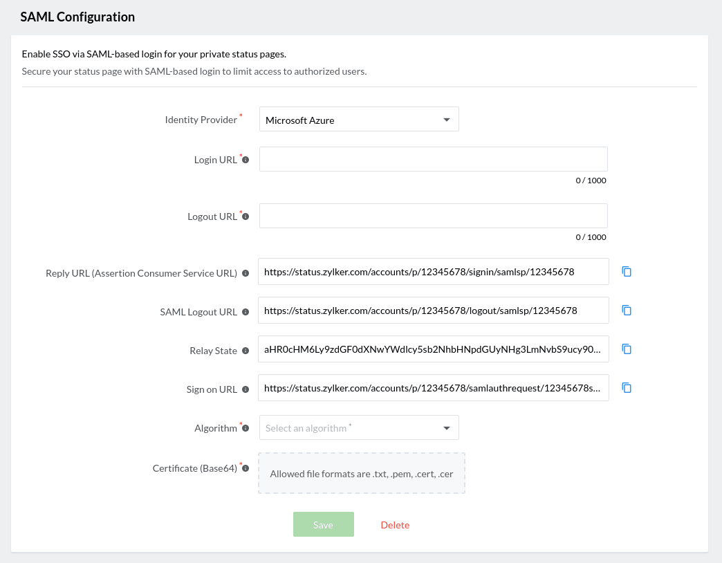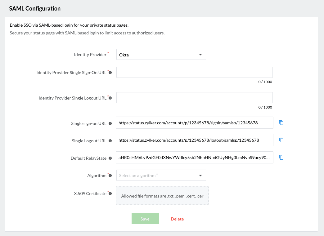 You can allow only your organization's employees to access private status pages by requiring login authenticated via Security Assertion Markup Language (SAML).