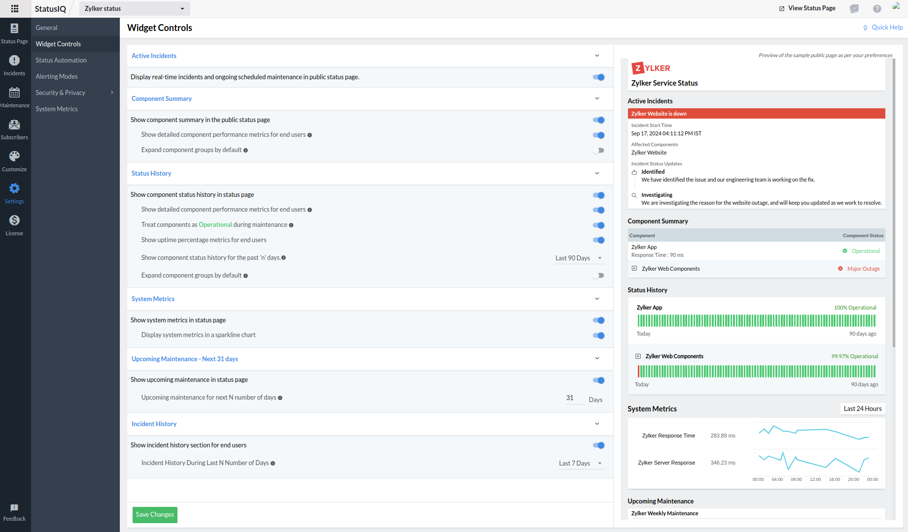 Under Widget Controls, you can enable or disable the various sections in your status page. To make changes in Widget Controls, go to Settings >Widget Controls. There are five different sections under Widget Controls, namely: