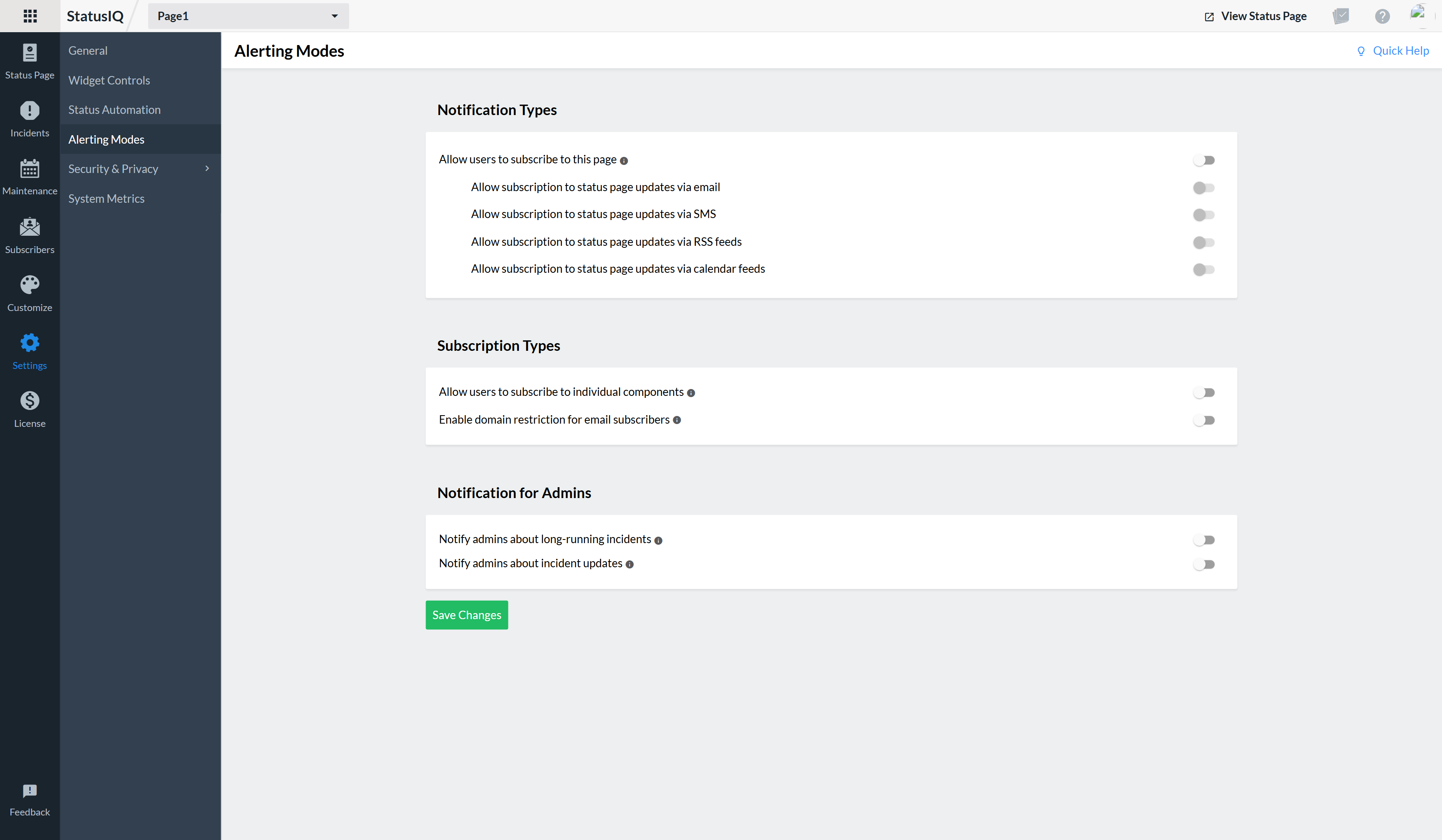 By setting preferences in the Alerting Modes section, you can choose to show or hide options for users to subscribe to status page updates via email notifications, SMS notifications, or RSS feeds.