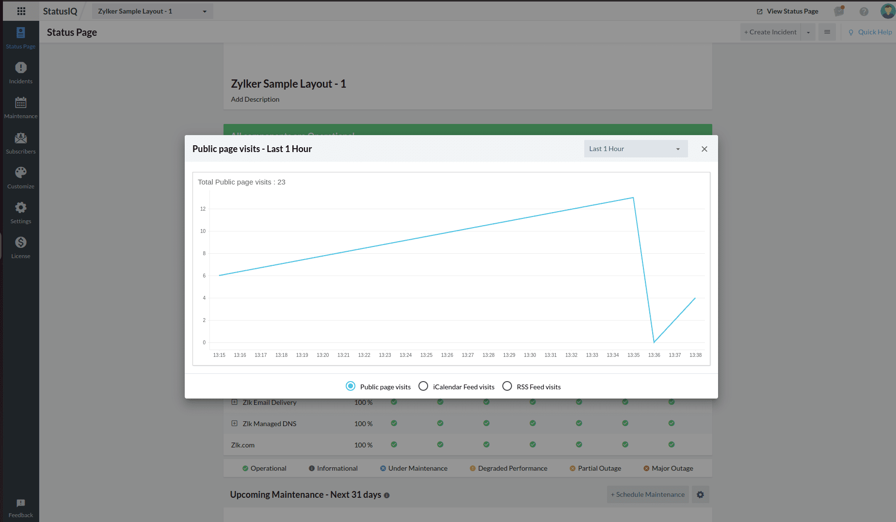 To track the page analytics of your status page, you can click on the hamburger ☰ icon on the title bar in the StatusIQ home page. Use this feature to monitor page visits to your status page within your preferred timeframe. It provides insights into public page visits, iCalendar feed visits, and RSS feed visits.