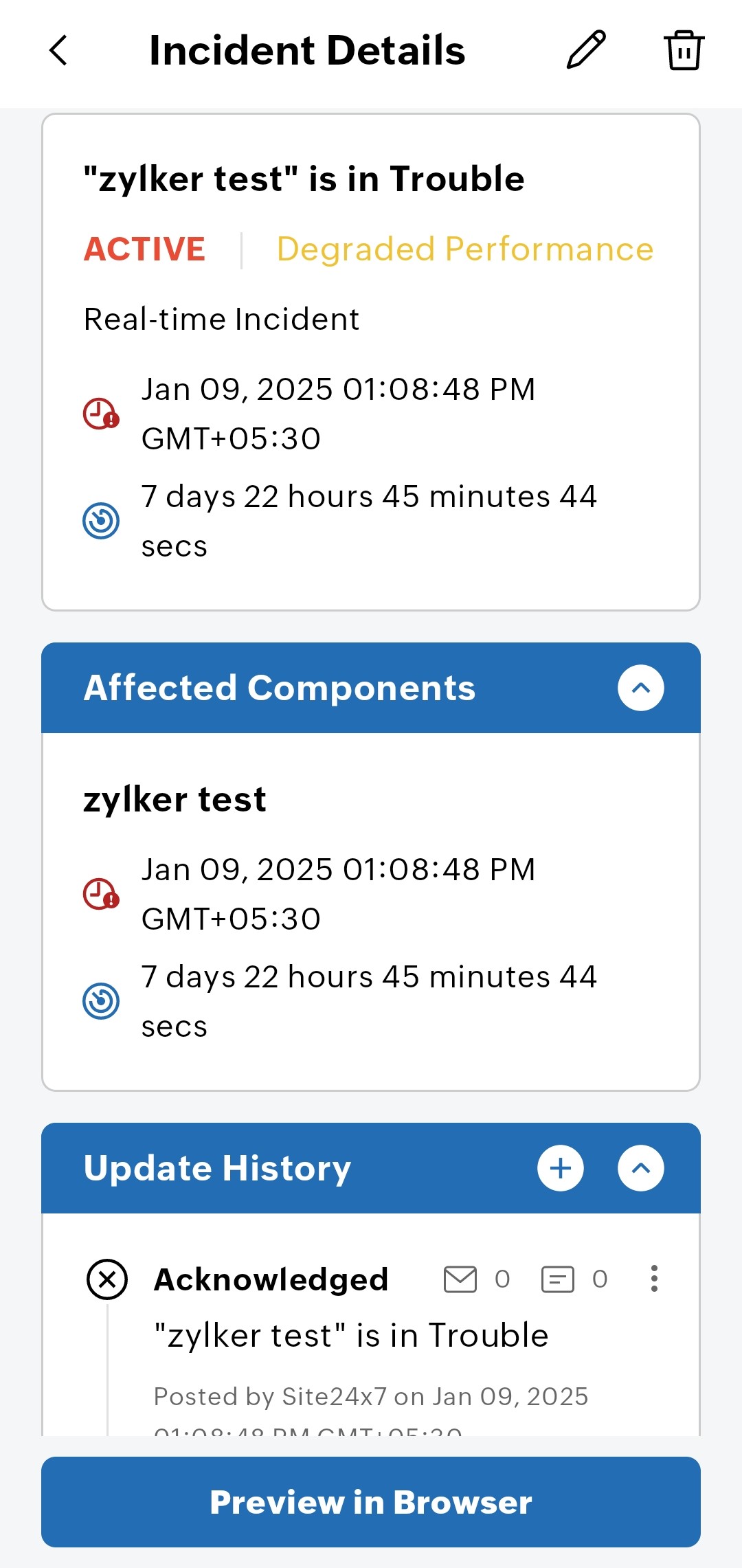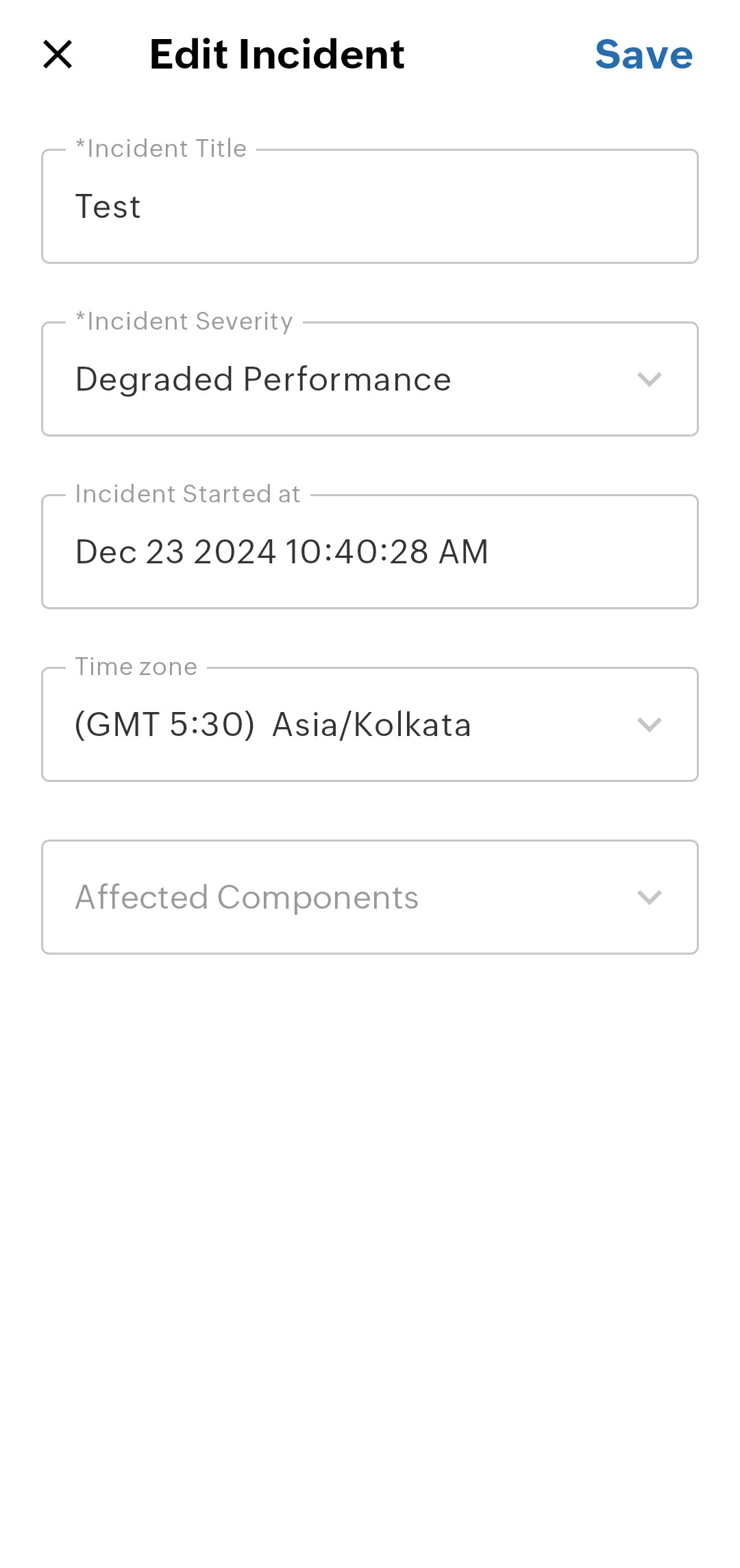 Edit: Here you can modify Incident Title, Incident Severity, Incident Start Time, Time Zone, and Affected Components.