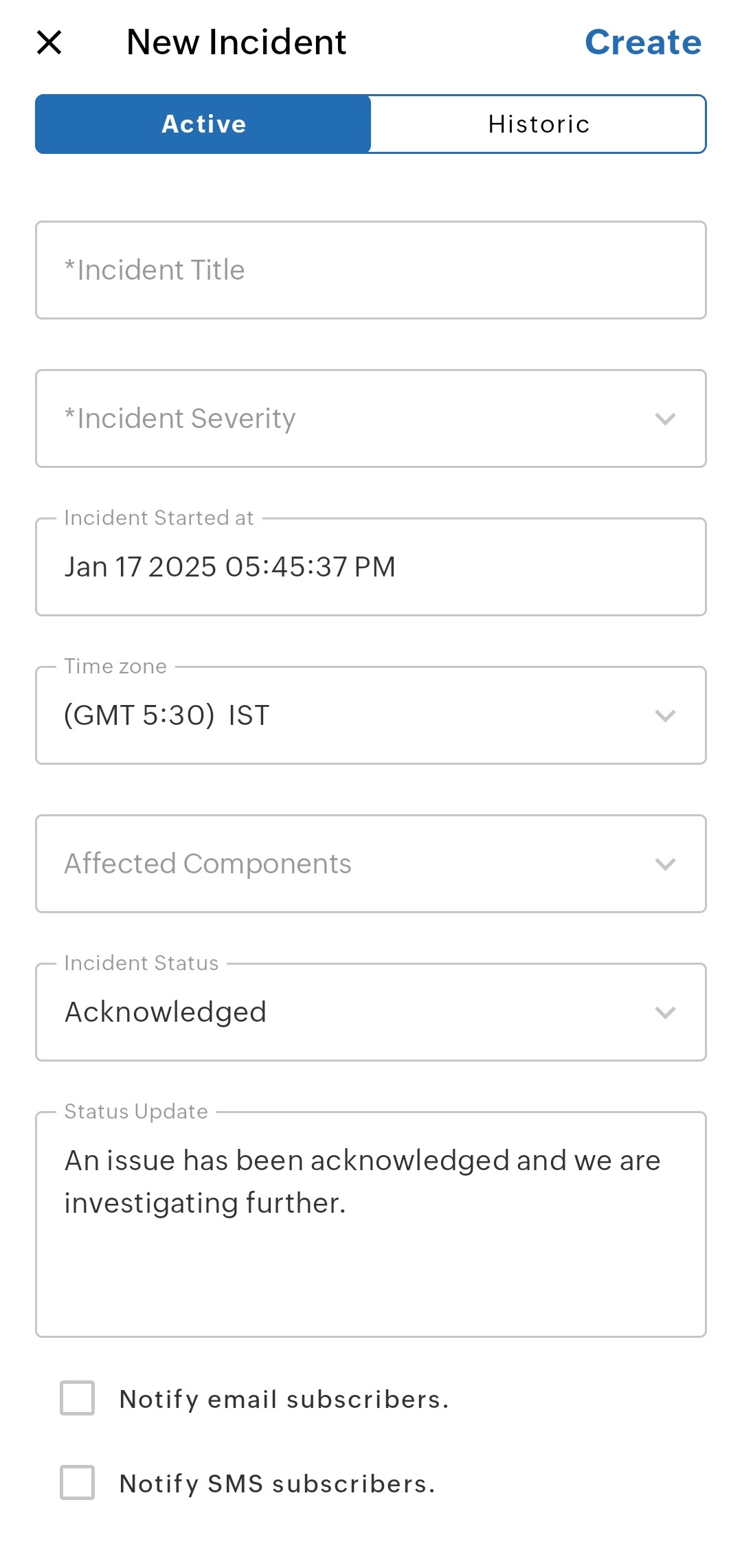 icon on the bottom-right corner to create a new incident. - Select Active if it is a current incident or Historic if it is a past incident.