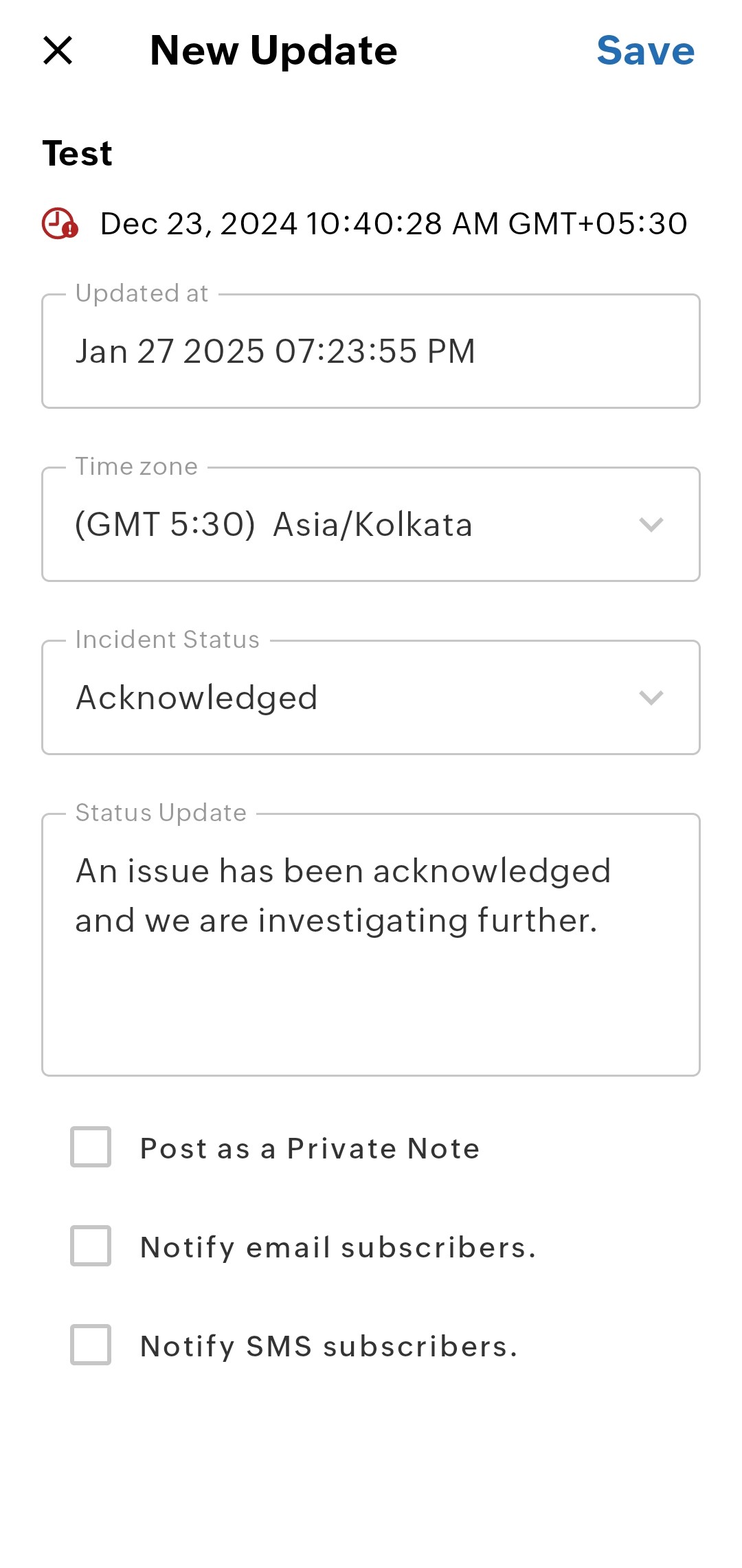 Post Update: This is available only for an active incident. You can modify Updated at time, Time zone, Incident Status, Status Update, Post as a Private Note, Notify email, and SMS subscribers.