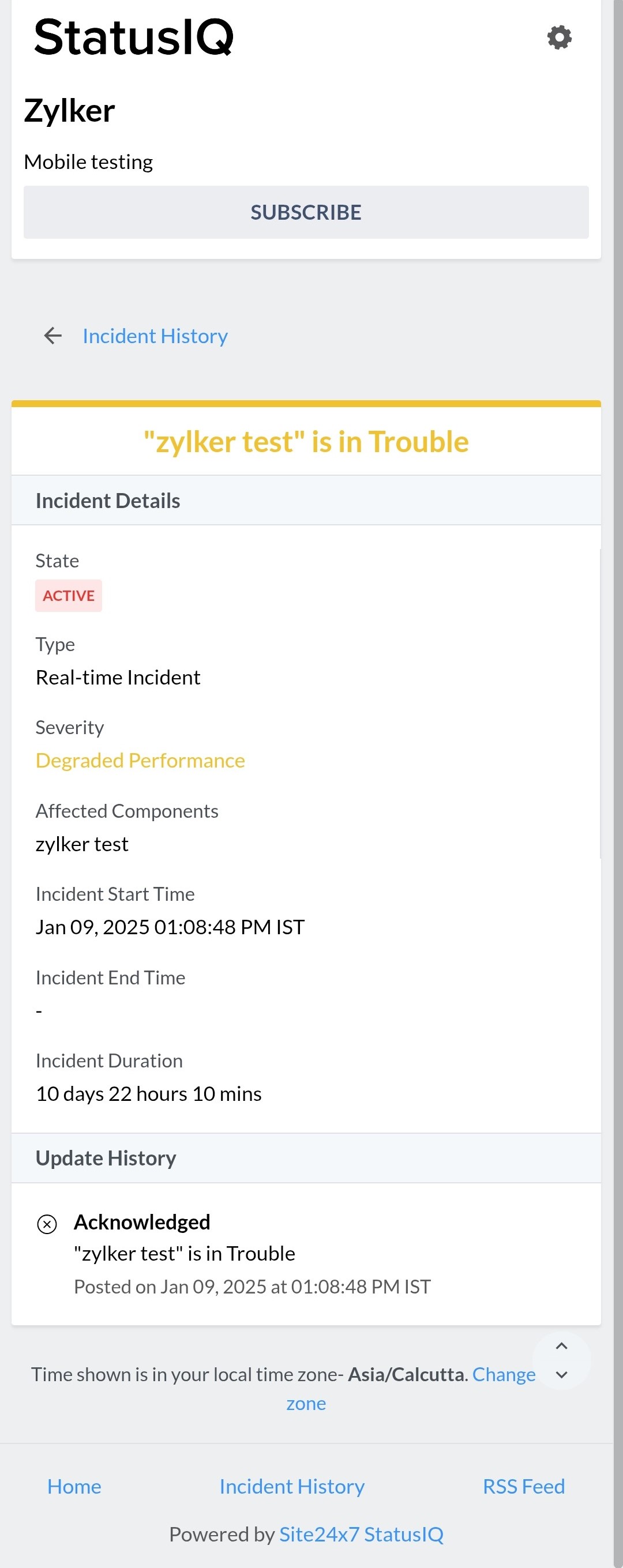 Site24x7's StatusIQ ensures clear and transparent communication by allowing technicians to provide real-time updates on incidents. The StatusIQ mobile app takes this a step further, delivering instant updates directly to your fingertips. Even without access to a laptop or desktop, you can monitor ongoing issues, track progress, and keep your customers informed with continuous updates on your status page just with your mobile device.