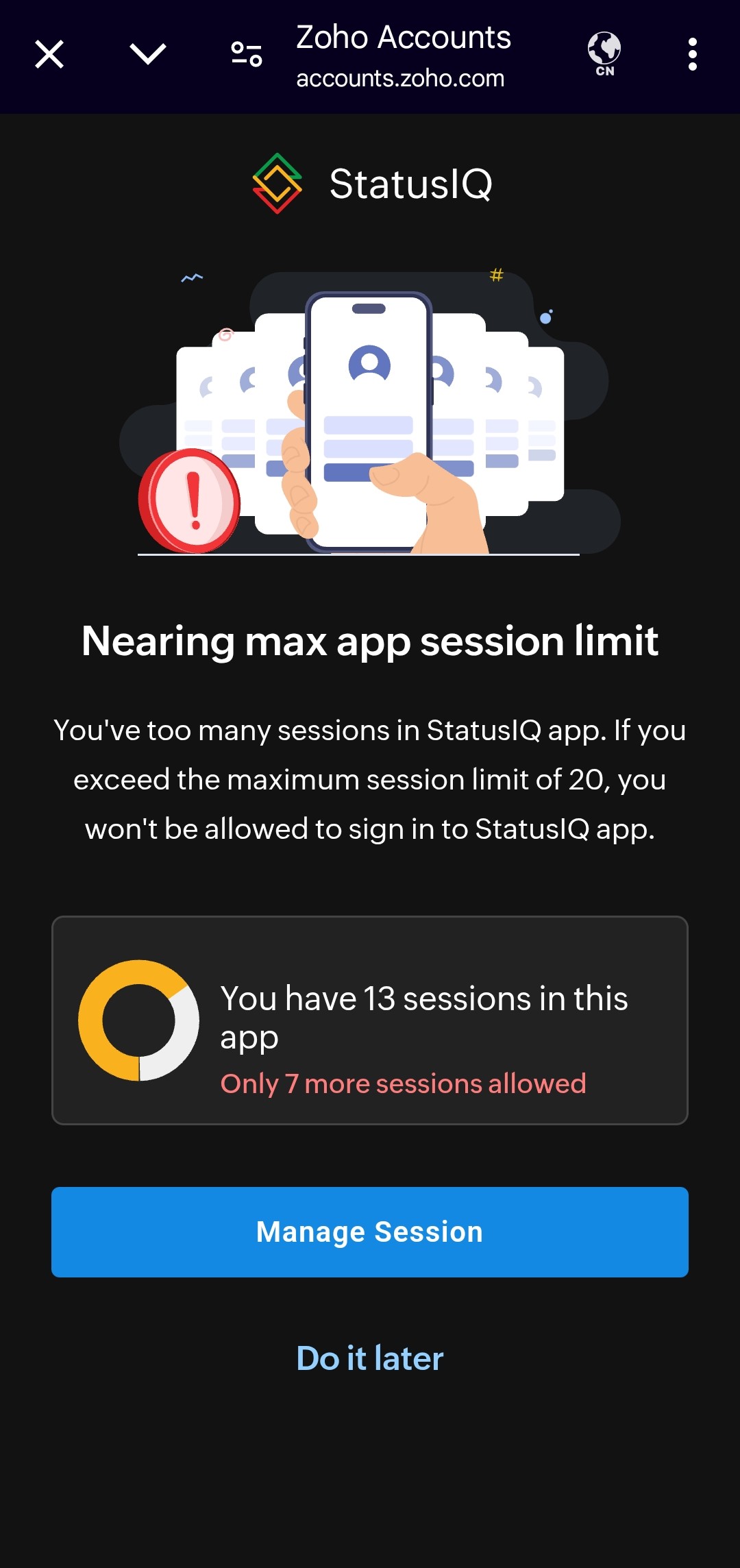 NoteYou can only have a maximum of 20 active sessions for the StatusIQ mobile application. You will receive the following notification when you have logged in with the same user account on multiple devices.