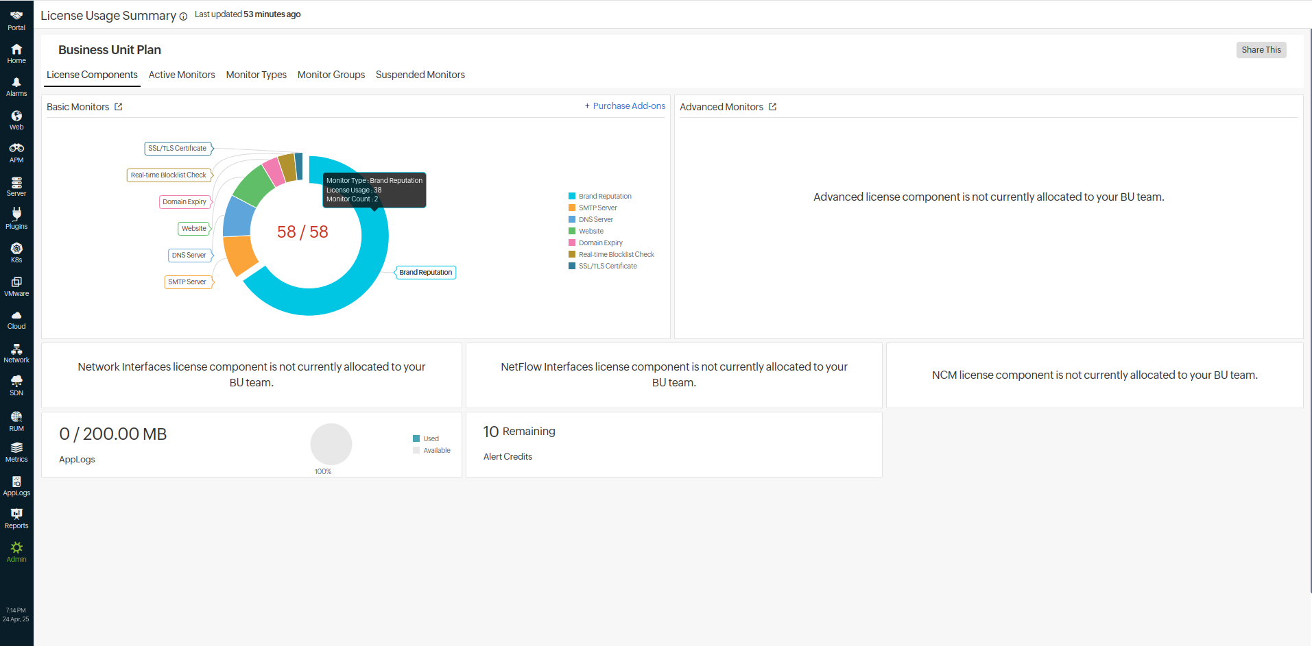 - Suspended Monitors: View the suspended monitors that no longer consume licenses. The usage numbers indicate the licenses required to reactivate them. Click the icon to Activate, Delete, multi-select, and take bulk action on them.