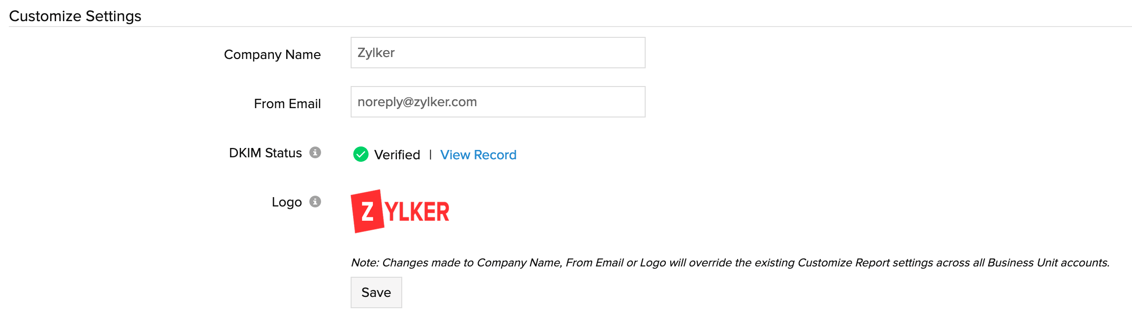 Changes made to the Company Name, From Email, or Logo will override the existing report settings across all business unit accounts.