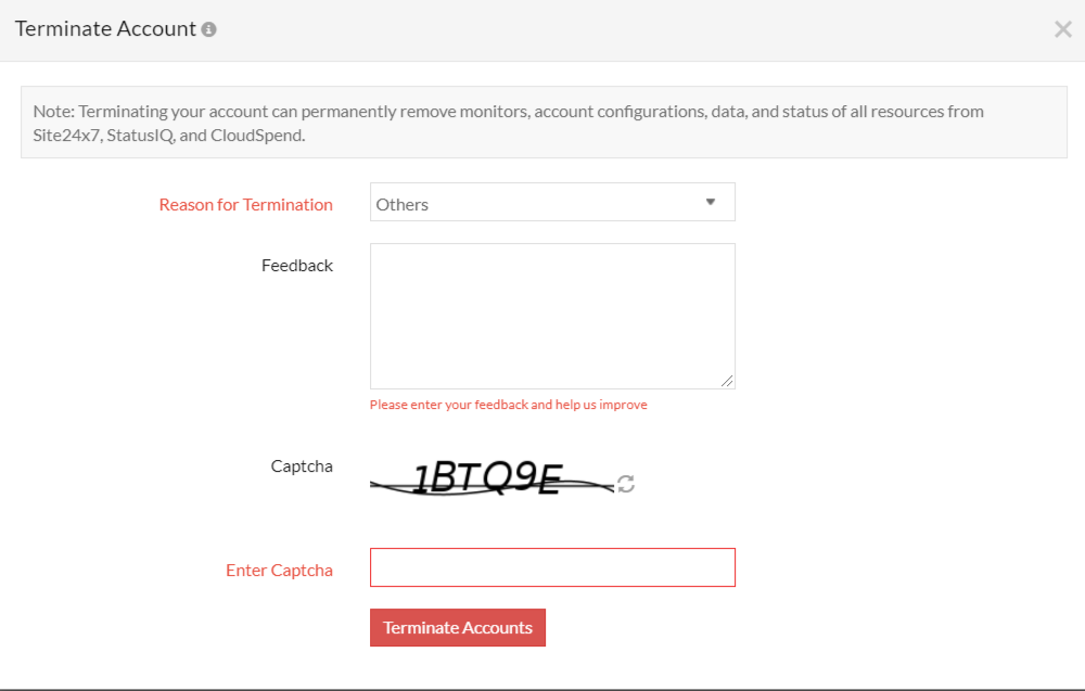 NoteBy terminating your account, all the data and configurations in all the three Site24x7 products (Site24x7, StatusIQ, CloudSpend) will also get deleted. However, your Zoho Organization account will not be deleted by this action.